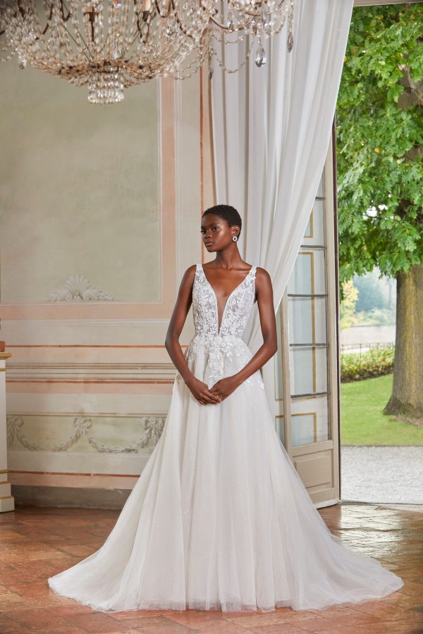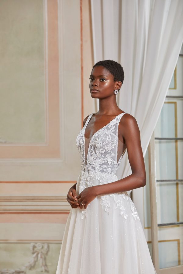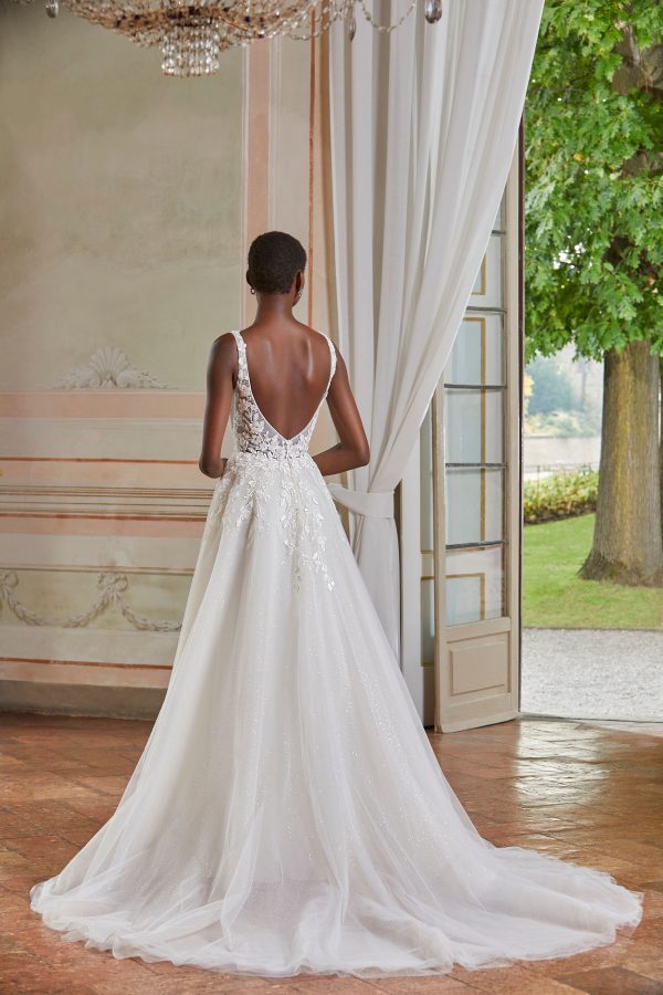 Vestido de novia con encaje floral con pedrería y un tul en la falda evasé. El escote pronunciado con tiras da paso a una sexy espalda baja. Demetrios