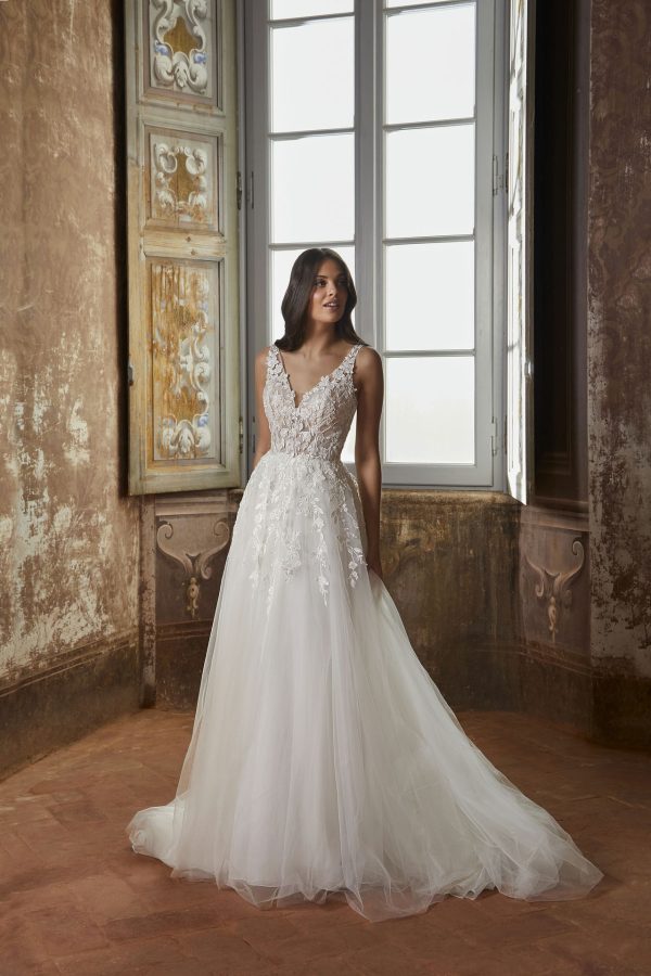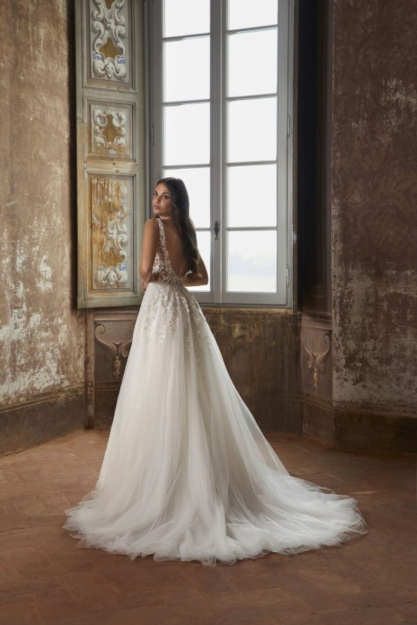 Vestido de Novia con un delicado encaje adorna el detallado corpiño con un pronunciado escote en V esculpido y una cautivadora espalda escotada. Una falda de tul añade la cantidad justa de volumen para completar el look.
