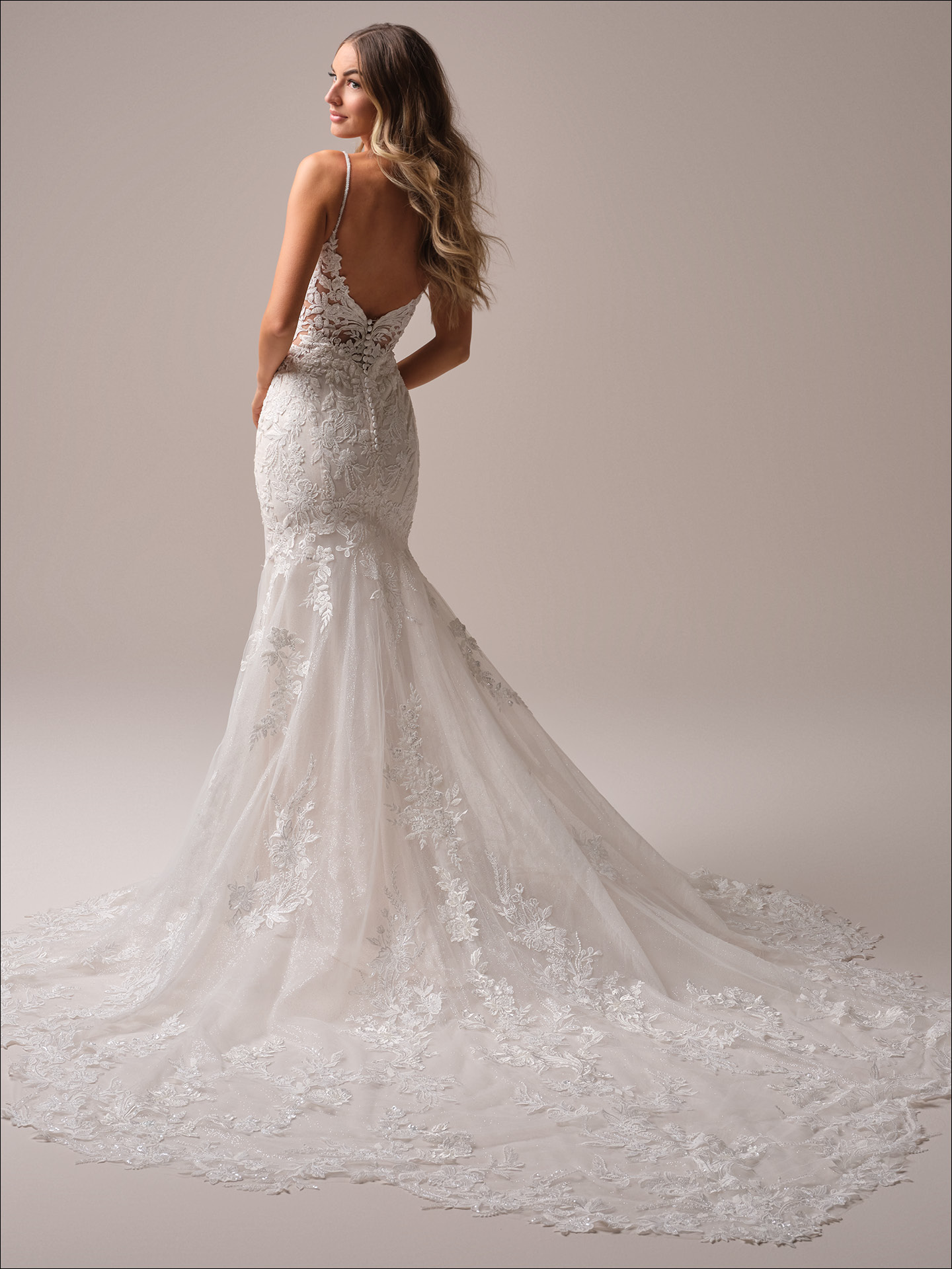 Vestido de novia elegante ajustado de corte sirena con escote profundo y pedrería de Maggie Sottero