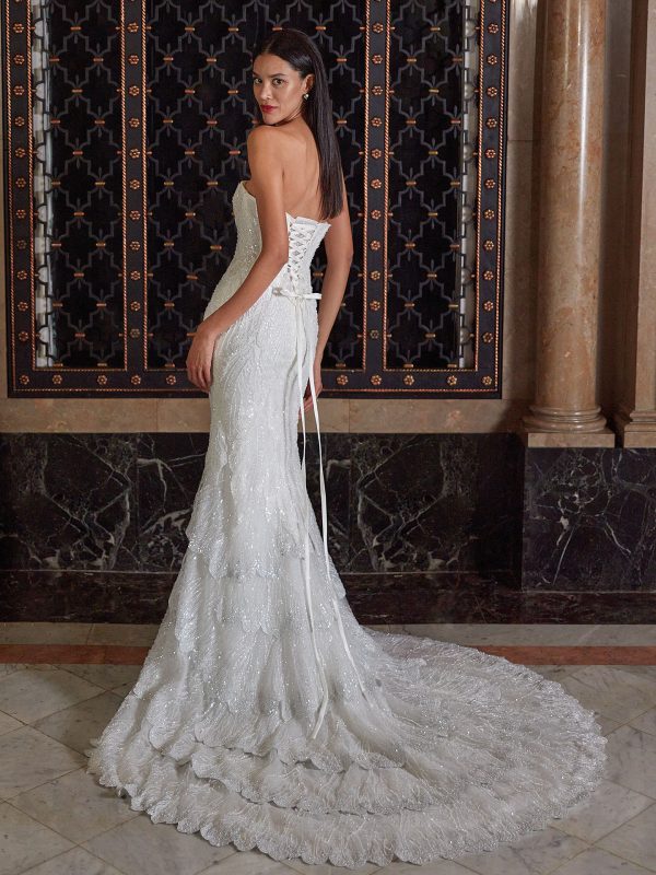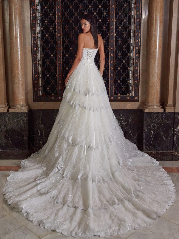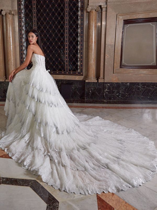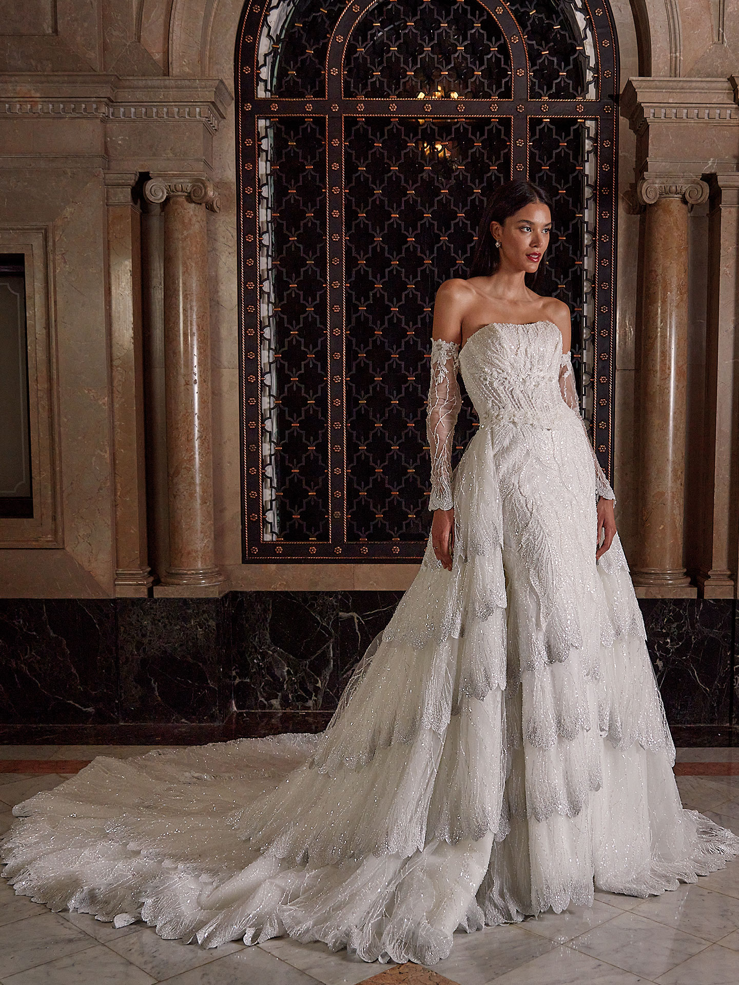 Una creación de alta costura inspirada en la época dorada de la moda de los años 50, el vestido Seraphina combina la elegancia vintage con el glamour moderno. Un encaje con cuentas, delicadamente bordado, esculpe el corpiño sin tirantes, mientras que las capas de tul festoneado brillante caen en cascada formando una cola espectacular que brilla a cada paso. Las mangas SL130 y el collar COL22 a juego realzan el look, ofreciendo textura y maestría que evocan los orígenes de la alta costura del vestido. Una sobrefalda extraíble transforma la silueta de elegante a voluminosa, aportando grandeza y versatilidad a esta inolvidable pieza nupcial.