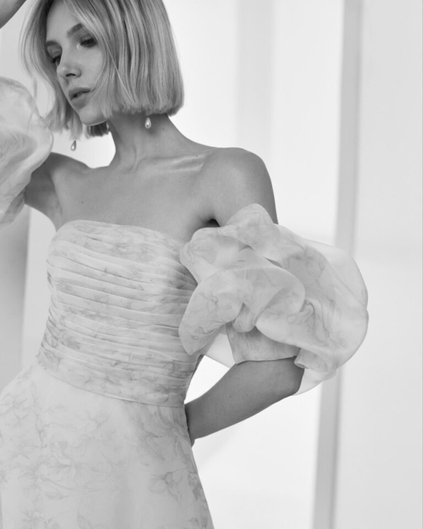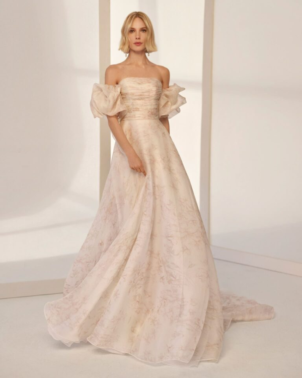 Vestido de novia de corte A, realizado en organza estampada ; con cuerpo palabra de honor drapeado. Aire Barcelona
