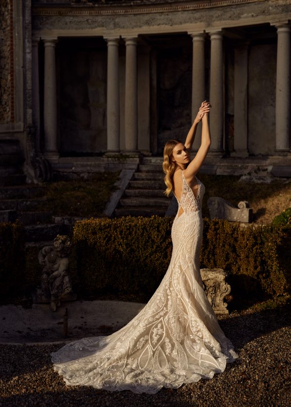Vestido de Novia Sirena, Opulento, atrevido e innegablemente sexy, el modelo presenta seductores detalles transparentes junto con lujosos encajes y tules bordados. Los tirantes caprichosos dan paso a un corpiño con escote en V pronunciado y espalda escotada sexy. La sensual falda ceñida al cuerpo ofrece una cola transparente adornada opcional. Randy Fenoli
