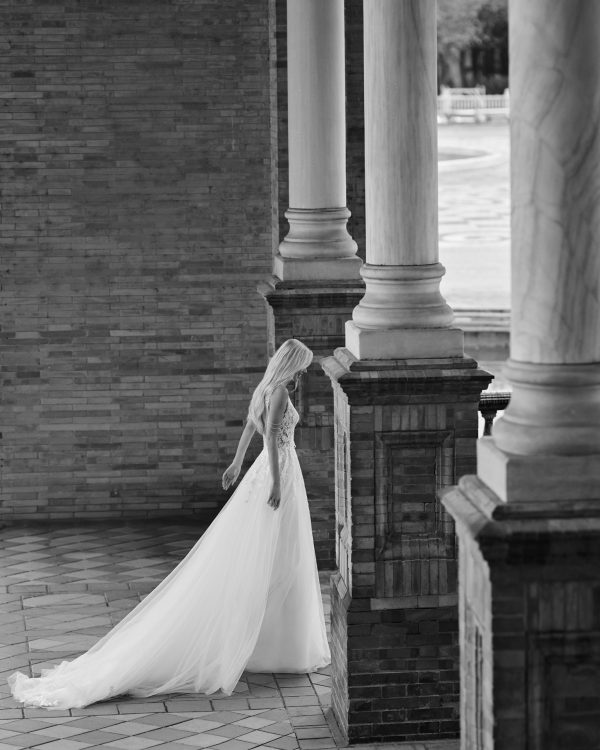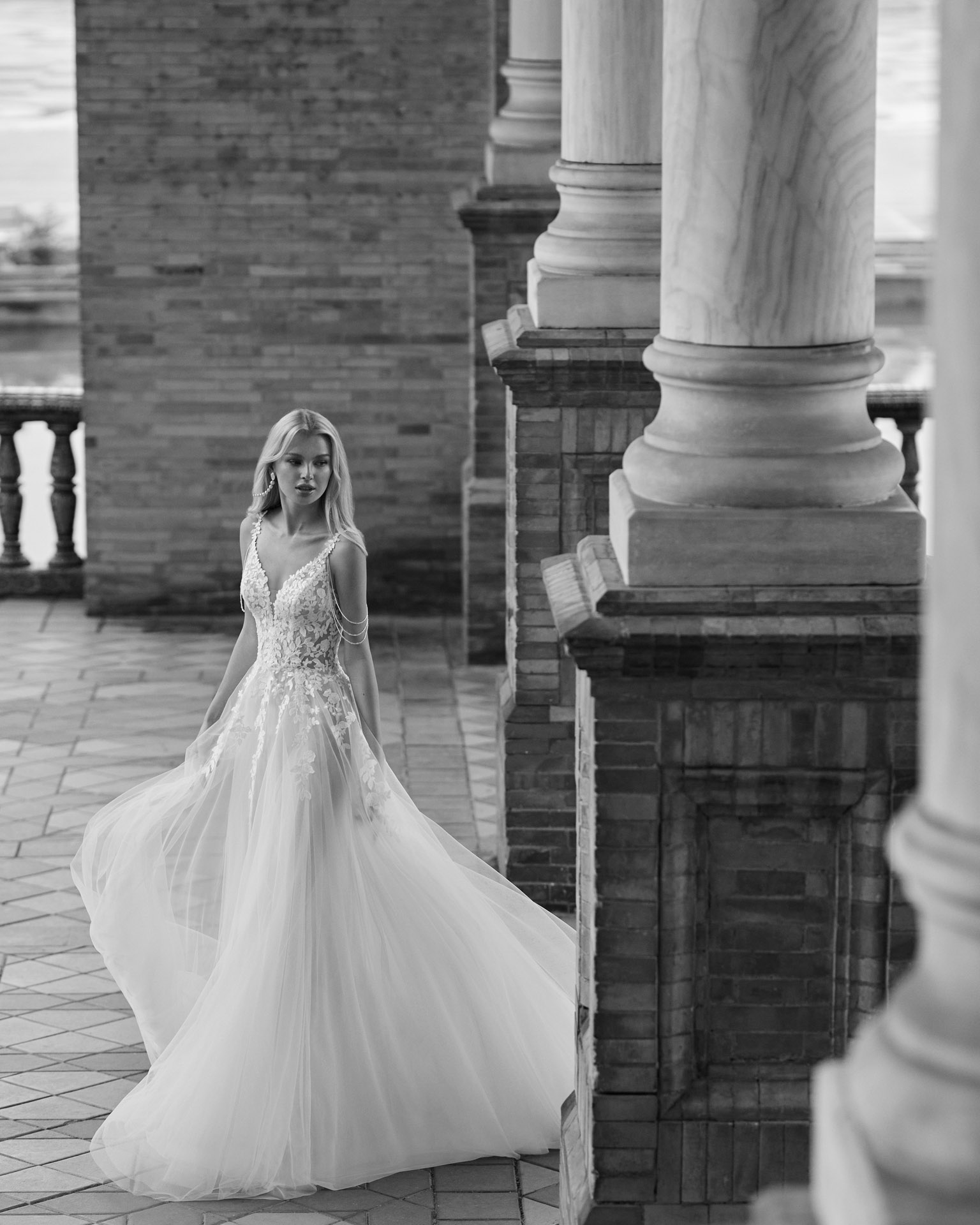 Vestido de novia, largo línea A. Elaborado con tul, cuerpo de encaje, escote ilusión y tirantes. Espalda escotada.