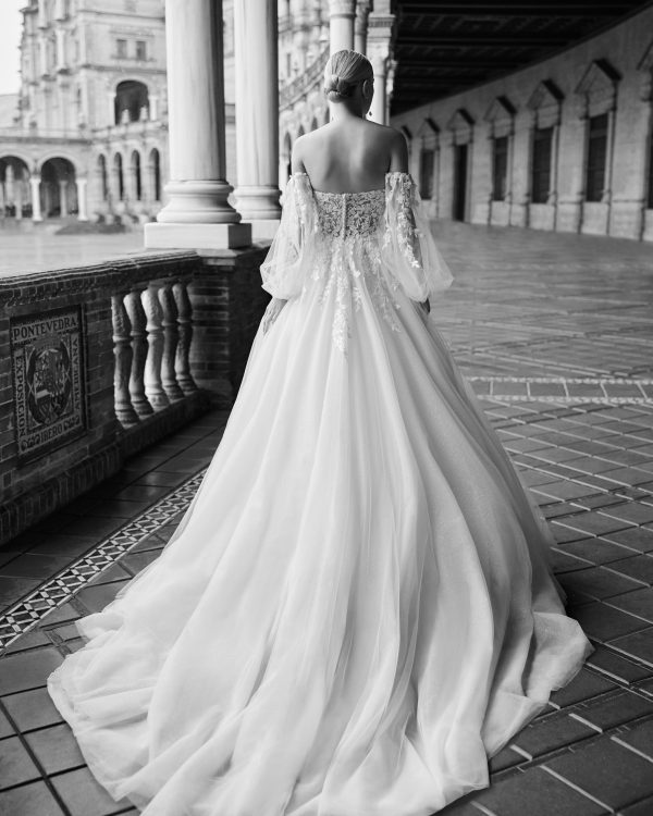 Vestido de novia, largo línea A. Elaborado con tul, escote corazón, manga abullonada y espalda abotonada. Incluye tirantes caídos desmontables.