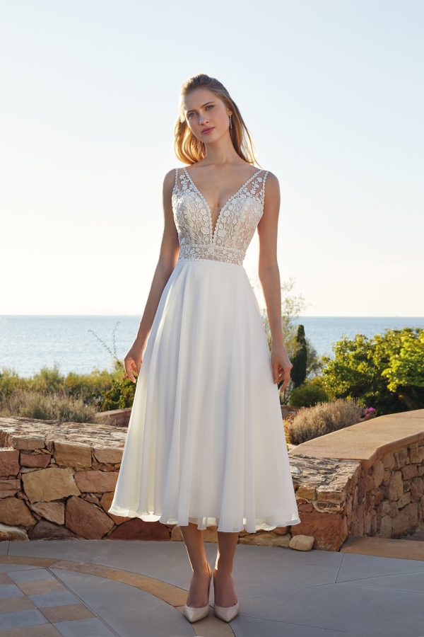 Vestido de novia corto sin mangas con cuello en V y una espalda sexy. La gasa similar a una nube y el encaje floral. Demetrios
