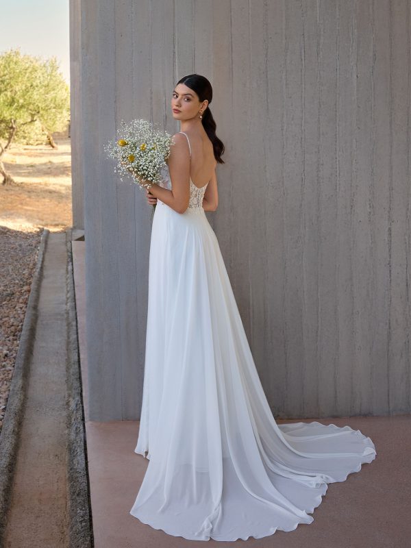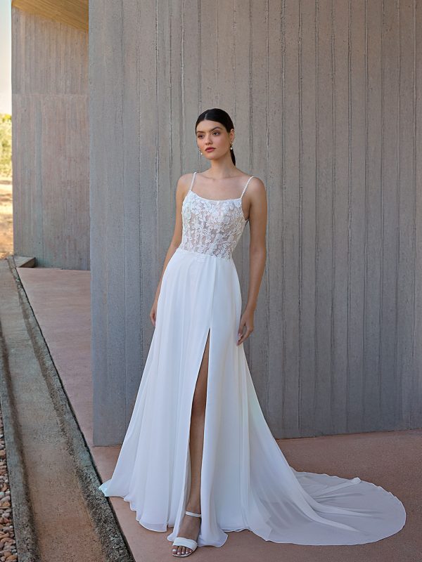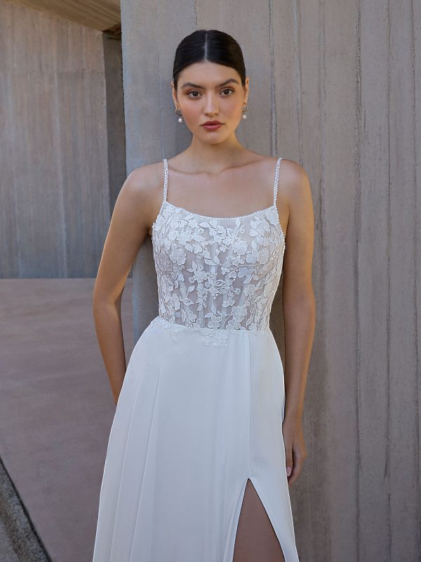 Vestido de Novia con una hermosa combinación de encaje transparente y delicados tirantes con escote cuadrado, el estilo L1164 irradia un aire nupcial suave pero moderno. Su falda de gasa fluida con abertura frontal lo convierte en una prenda esencial, romántica y sin esfuerzo.