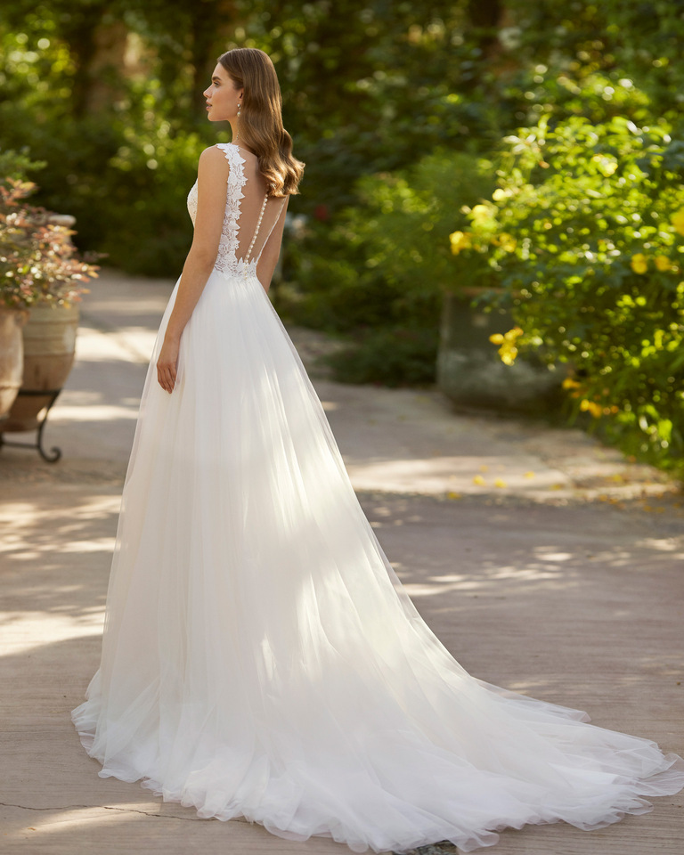 Vestido de novia línea A y estilo romántico, con body de guipur y falda de tul. Con escote en V y espalda con botones perla, este exclusivo modelo Alma Novia te va a enamorar. Antes 1499€ Ahora 999€. Alma Novia