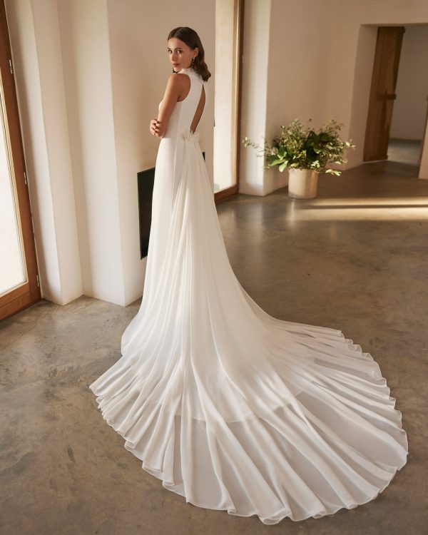 Vestido de novia largo de dos piezas y corte recto. Confeccionado en crepé con adorno floral, escote halter y espalda abierta con cola.