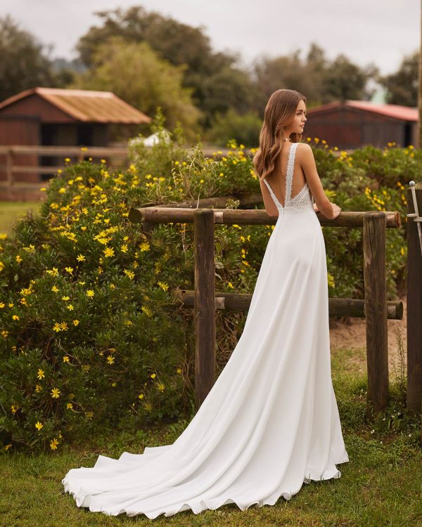 Vestido de novia largo de corte recto. Confeccionado en crepé y guipur con escote halter, tirantes y espalda en V.