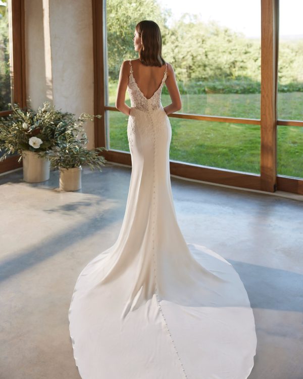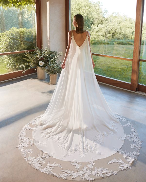 Vestido de novia largo, de dos piezas y corte sirena. Confeccionado en crepé y encaje con escote ilusión, tirantes y espalda escotada con capa.