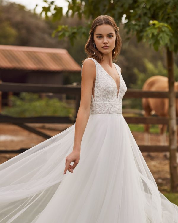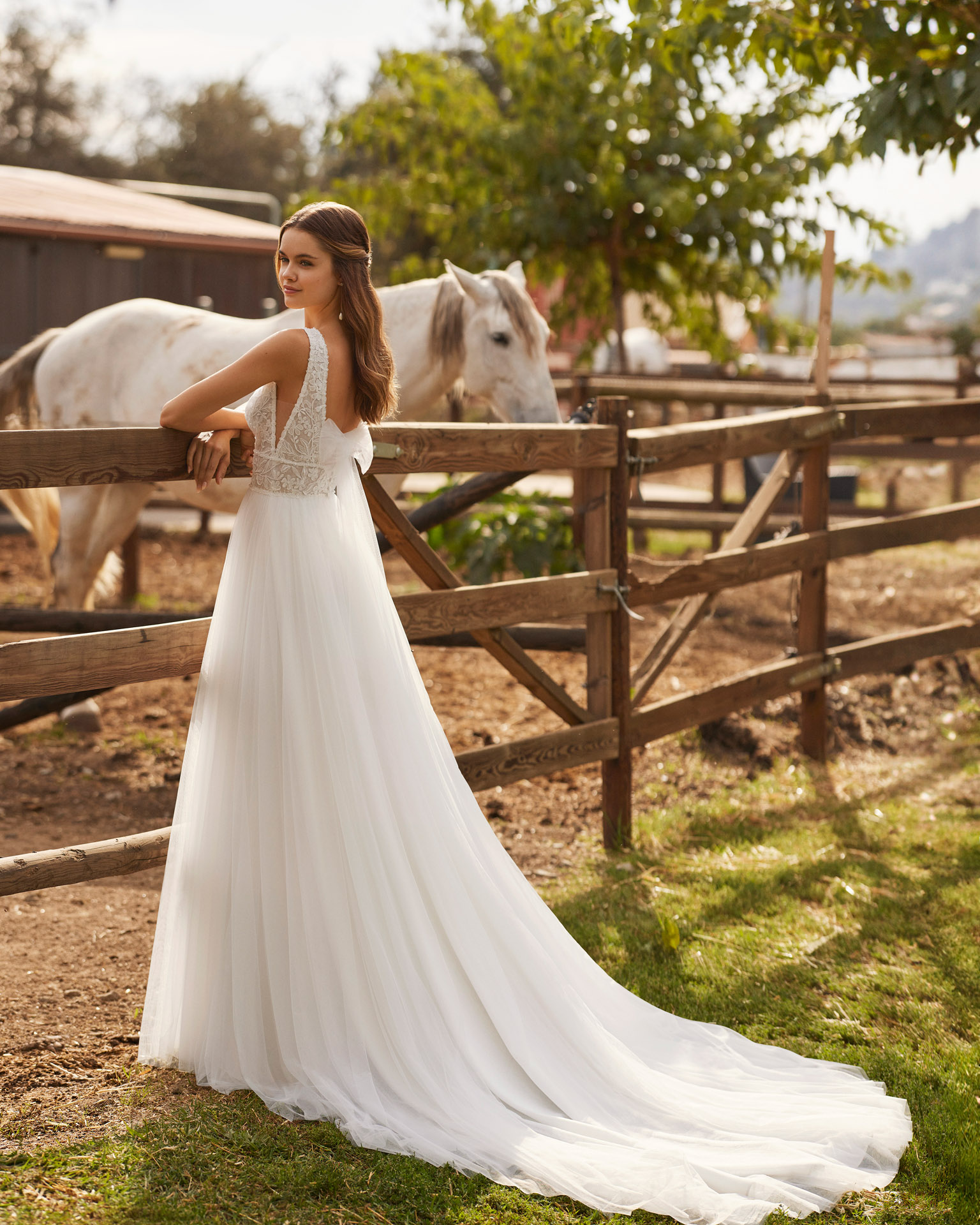 Vestido de novia largo, de corte recto. Confeccionado en tul y encaje con escote pico, tirantes y espalda con lazo de tul.