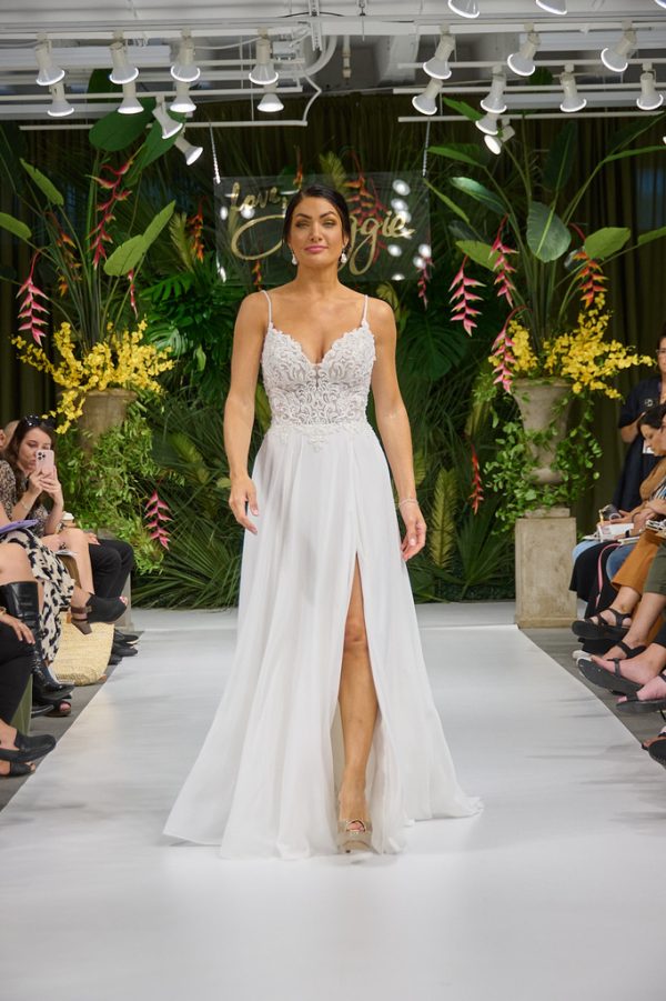 Vestido de novia de gasa de talla grande, corte A, abertura hasta el muslo y corpiño de encaje ilusión. Antes 1399€ Ahora 1125€. Maggie Sottero