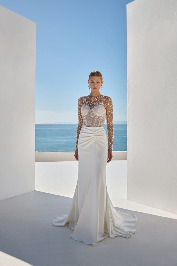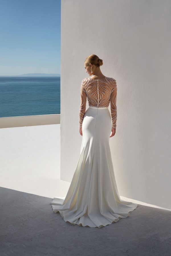 Falda de novia estilo sirena de crepé con exclusivo detalle fruncido. Mézclalo y combínalo con cualquier body para crear tu conjunto nupcial perfecto.