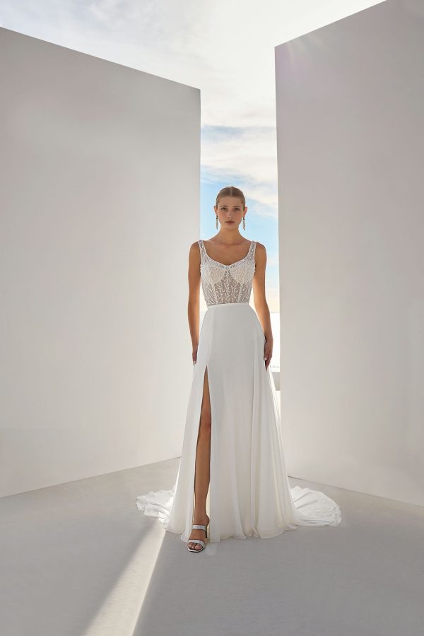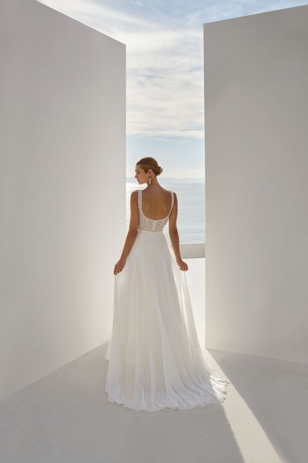 Falda de gasa ligera y aireada con abertura hasta el muslo. Mézclalo y combínalo con cualquier body para crear tu conjunto nupcial perfecto. Demetrios