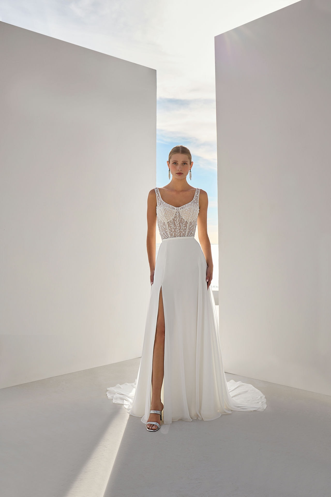 Falda de novia en gasa ligera con abertura hasta el muslo. Mézclalo con cualquier body para crear tu conjunto nupcial perfecto. Demetrios
