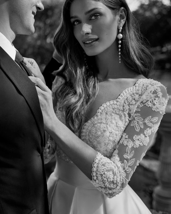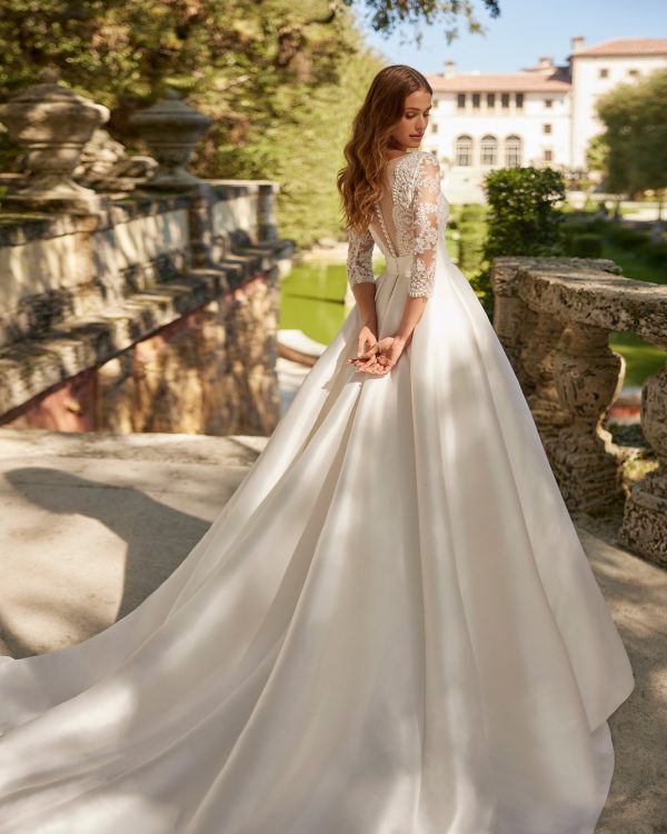 Vestido de novia con silueta en línea A y estilo clásico realizado en mikado combinado con encaje y pedrería. Este vestido de novia presenta un escote profundo, espalda e ilusión manga francesa y falda con bolsillos. Un look único aire Barcelona.