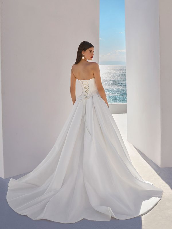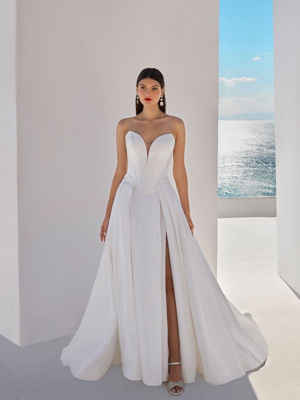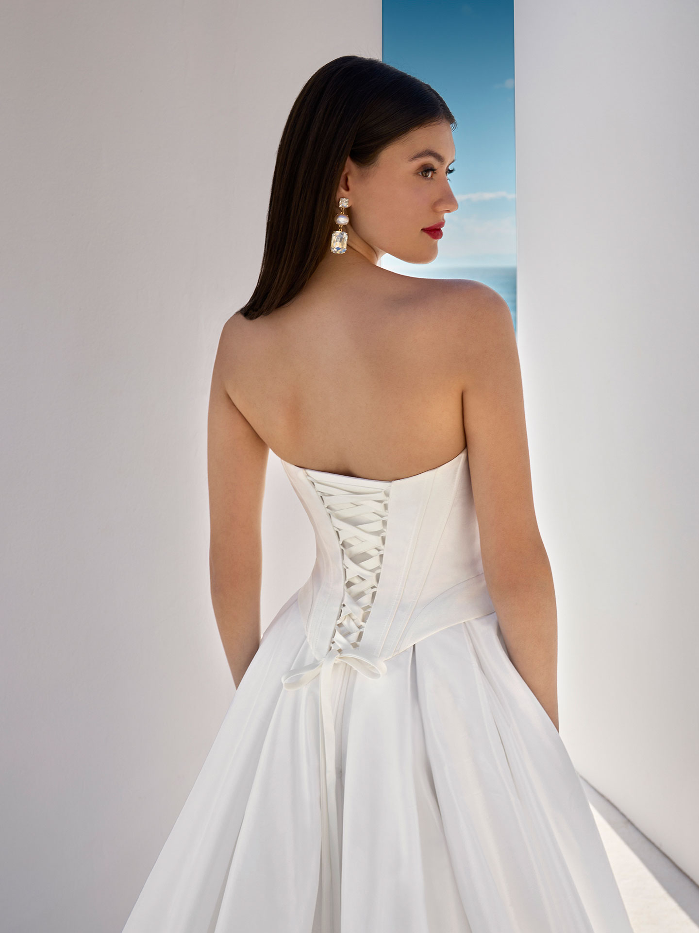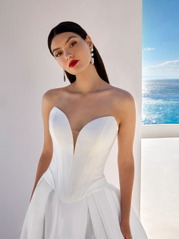 Top de novia esculpido a la perfección, este con corsé en forma de corazón presenta un escote dramático y varillas estructuradas para un toque nupcial moderno.
