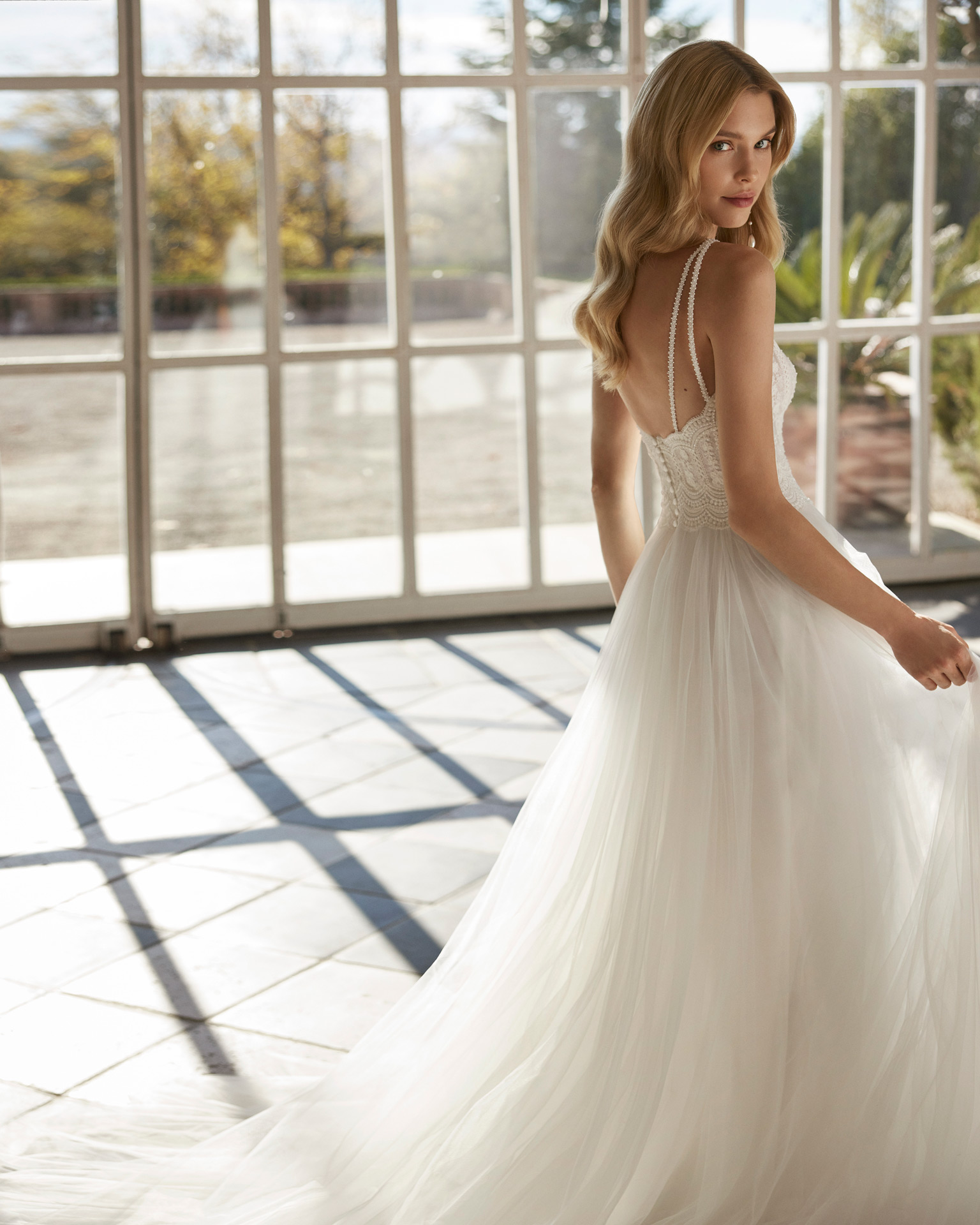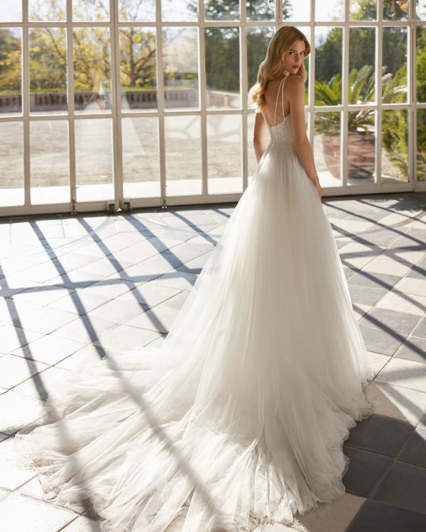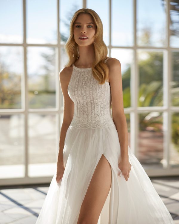 Vestido de novia largo, con silueta en línea A y estilo elegante, elaborado con tul suave con detalles en encaje. Presenta un escote redondo, una espalda abierta y una falda con abertura delantera. Un modelo de tendencia Aire Barcelona.