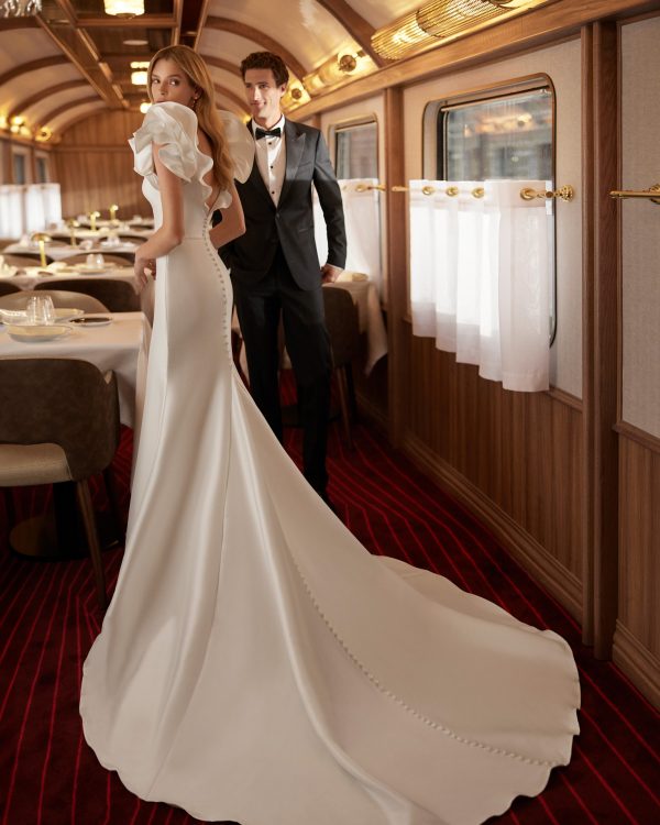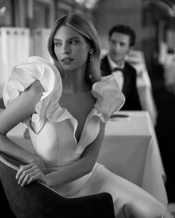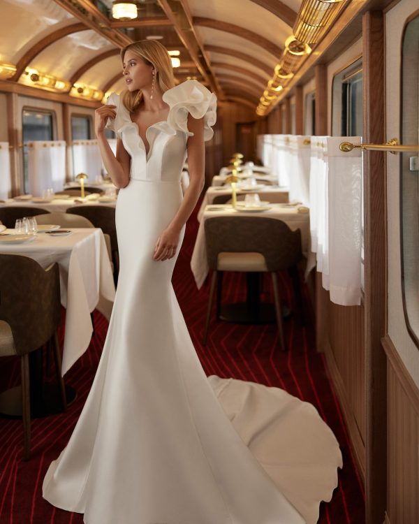 Vestido de novia largo, de corte sirena y estilo elegante, elaborado con mikado elástico. Presenta un escote en V, una espalda abierta y manga con volantes. Un exclusivo modelo Aire Barcelona.