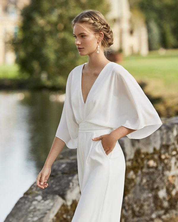 Vestido pantalón de novia de crespón. Escote en V ablusado,manga caída tres cuartos y espalda escotada.