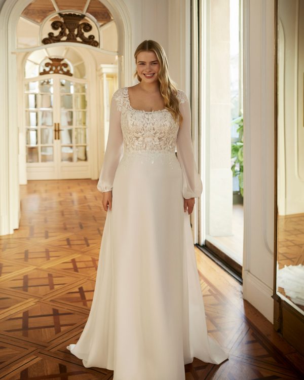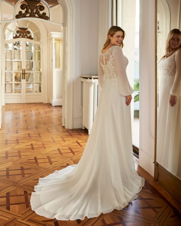 Vestido de novia evasé en georgette con encaje y pedrería. Escote cuadrado, manga abullonada y espalda escotada.